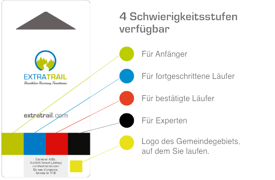 Die Beschilderung von EXTRATRAIL besteht aus kleinen Tafeln von 10 cm Länge und 20 cm Breite. Jedes Schild trägt das Logo von EXTRATRAIL und die Streckenverläufe in vier Farben: