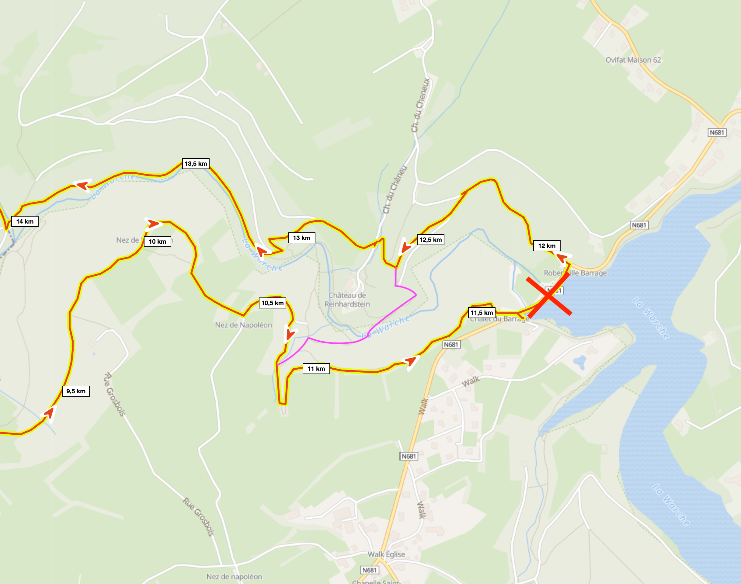 Het is mogelijk om dit gebied te omzeilen door eerder af te slaan (km 10,75) en de Warche door te waden onderaan het kasteel van Reinhardstein (zie roze lijn op de kaart).